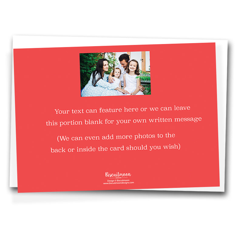 Professional Photographs: Please note, if your photo has been taken by a professional photographer you must get permission from the Photographer to use their photograph. By ordering from Biscuitmoon Designs you certify that you have obtained permission from your photographer to use the image in your announcement or Christmas card. It is illegal for me to reproduce any photo without consent